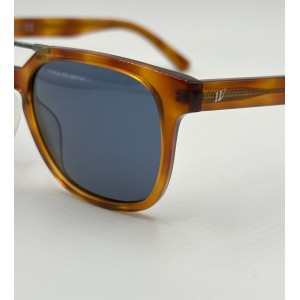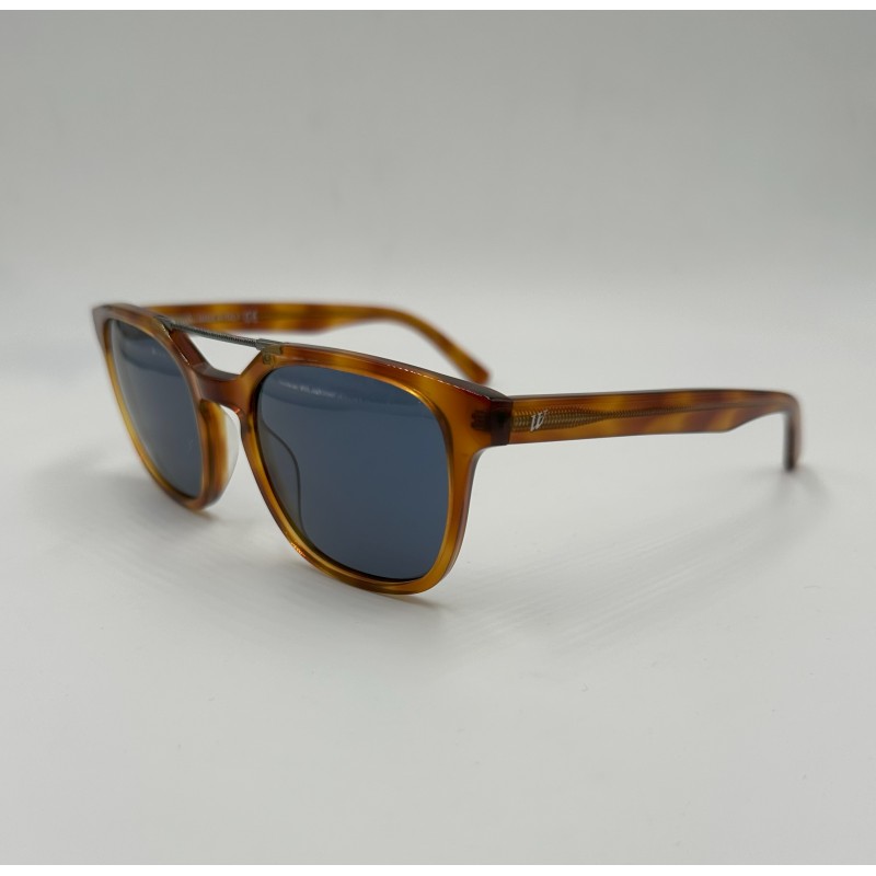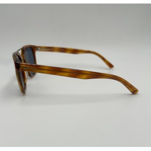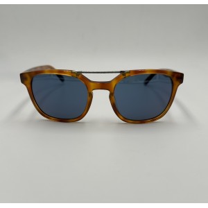 Montatura in acetato terra di siena lucido, lente squadrata blu tinta unita.