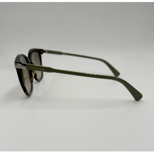 Montatura in acetato tartarugata con aste verde oliva, lente quadrata marrone sfumata.