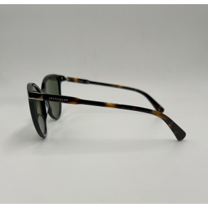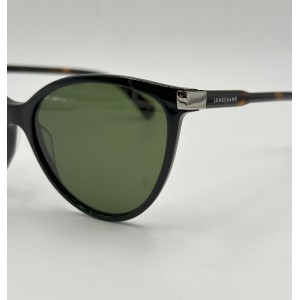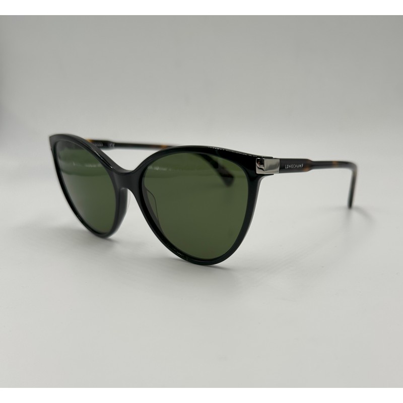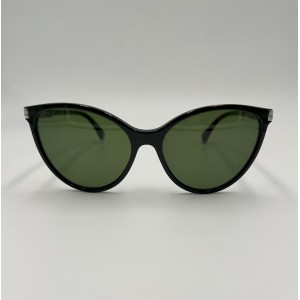 Montatura in acetato nera con aste tartarugata, lente a gatta tonda verde tinta unita.