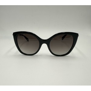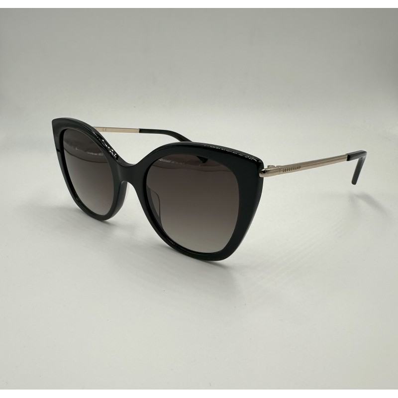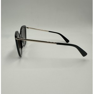 Montatura in acetato nera con aste oro, lente a gatta grigio sfumato.