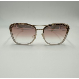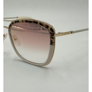 Montatura in acetato bianco-leopardato, lente a squadrata rosa flesciata.