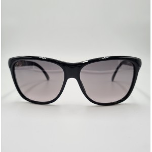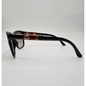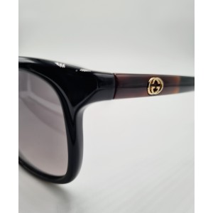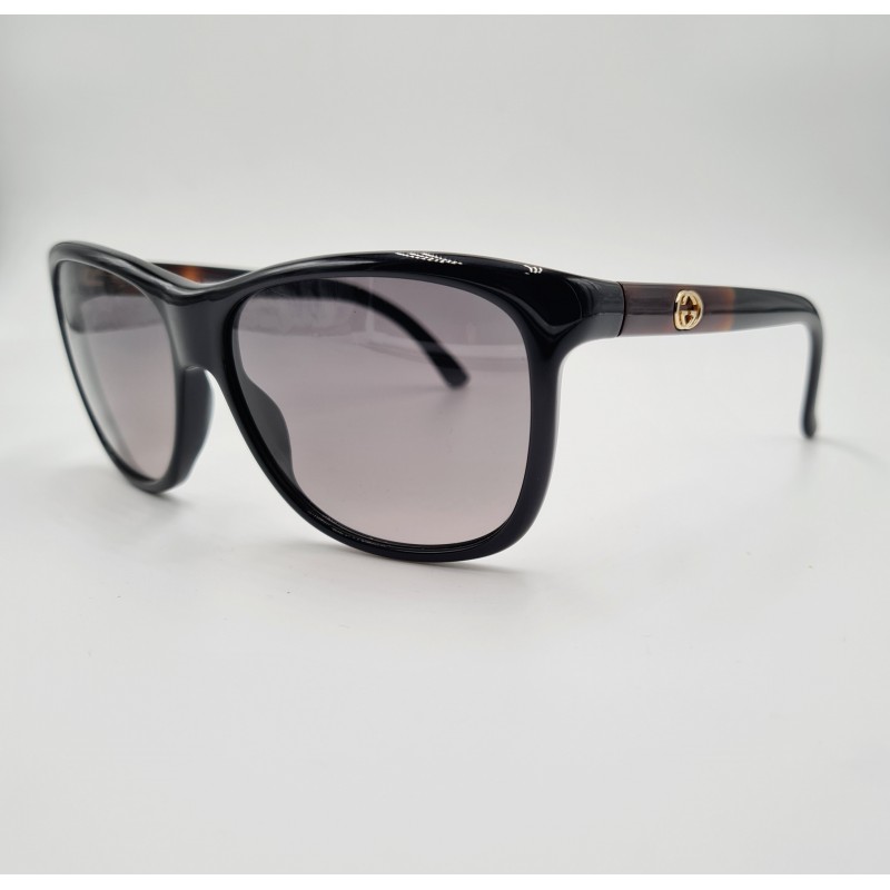 Montatura in acetato nero lucido, aste nere e tartarugate, lente squadrata grigia tinta unita, calibro 57.