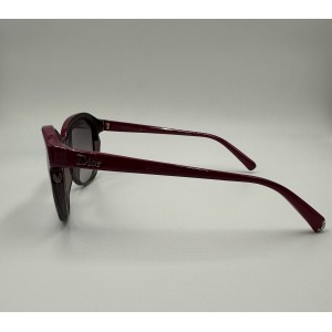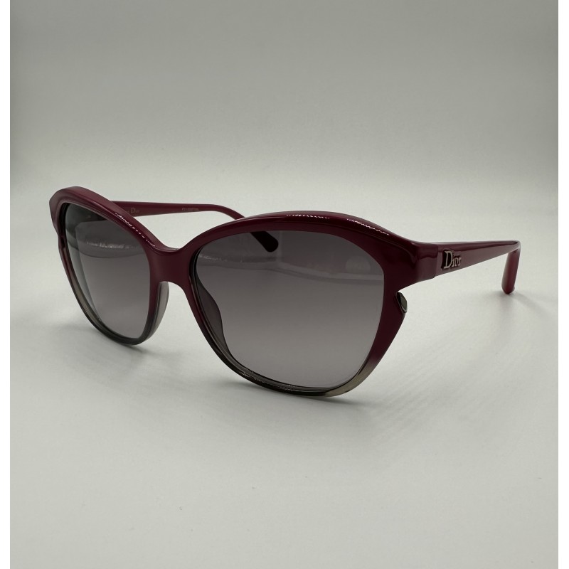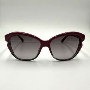Montatura in acetato con frontale ciliegia sfumato grigio, lente a gatta grigia sfumata, calibro 58.