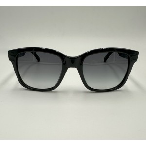 Montatura in acetato nero lucido, aste jeans e lente squadrata grigio sfumato.